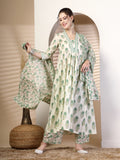 Olive Cotton Calf Length Printed Flared 3/4 Sleeves V Neck Kurta Suit Set