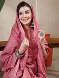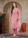Pink Cotton Calf Length Printed 3/4 Sleeve Mandarin Collar Straight Kurta Suit Set