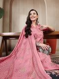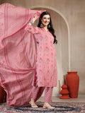 Pink Cotton Calf Length Printed 3/4 Sleeve Mandarin Collar Straight Kurta Suit Set is crafted for those who love timeless fashion with everyday ease. The outfit drapes naturally, offering both movement and style. Suitable for work hours or simple day outings, it promises a refreshing and sophisticated touch.