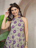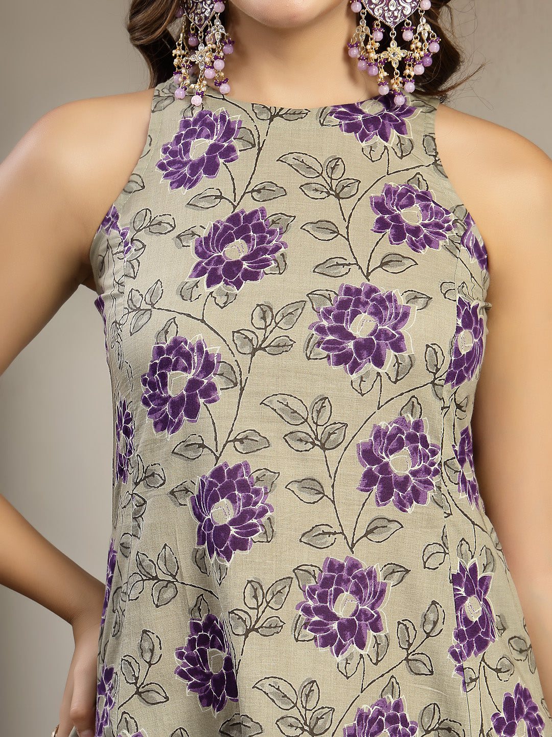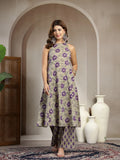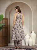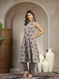 Purple Cotton Calf Length Printed Sleeveless Round Neck Flared Kurta Suit Set
