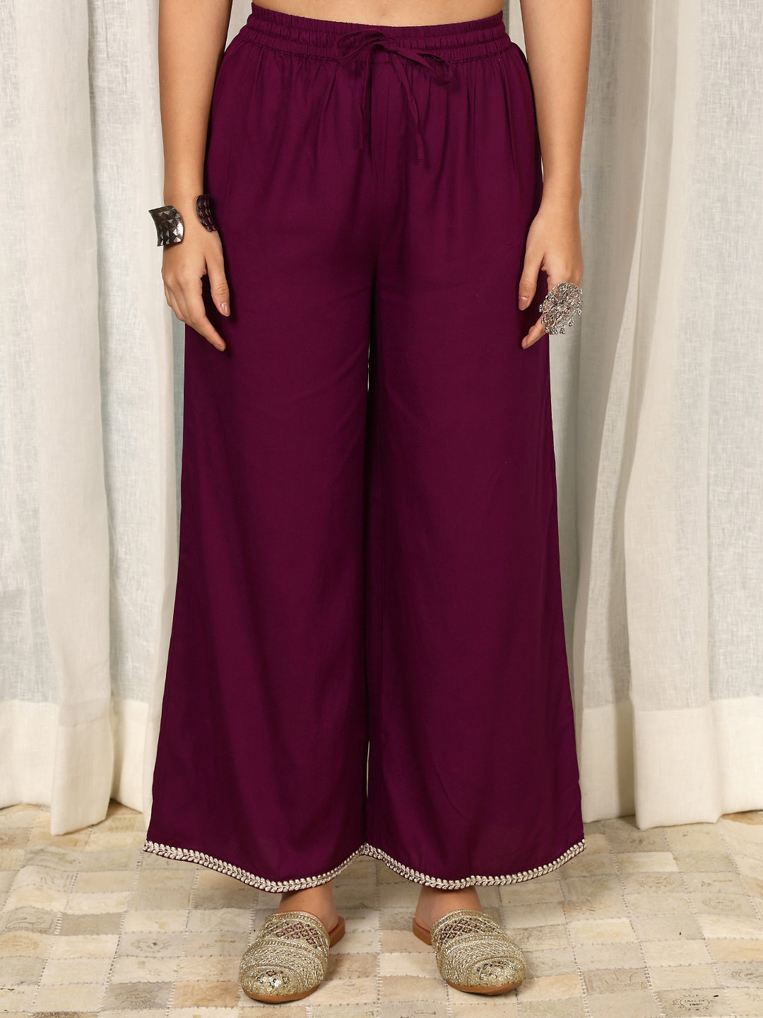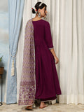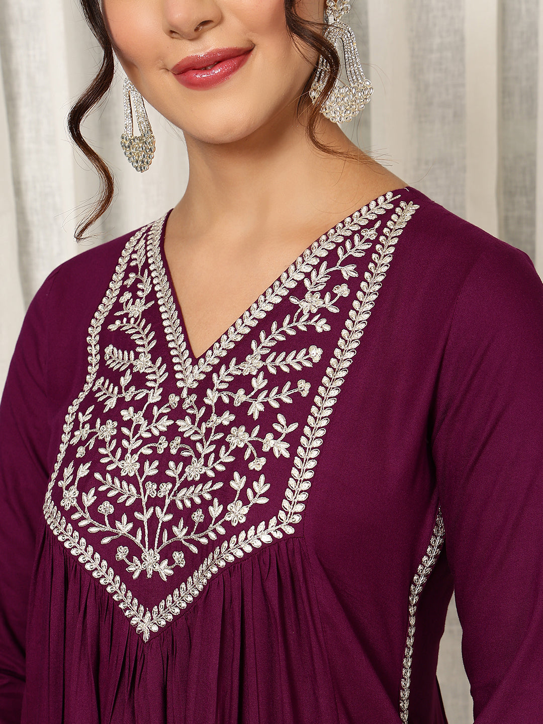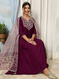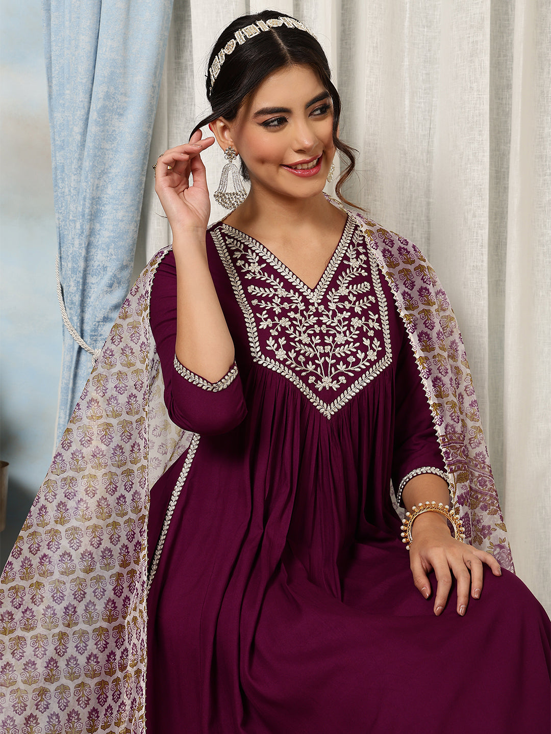 Purple Rayon Calf Length Solid Flared 3/4 Sleeves V-Neck Kurta Bottom Dupatta Set adds a refined charm to your wardrobe with its thoughtfully crafted silhouette. Light, comfortable and stylish, it works well for daily use, informal meet-ups or relaxed occasions, keeping you effortlessly fashionable.