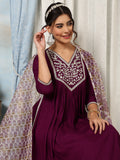 Purple Rayon Calf Length Solid Flared 3/4 Sleeves V-Neck Kurta Bottom Dupatta Set