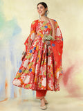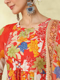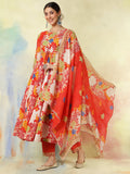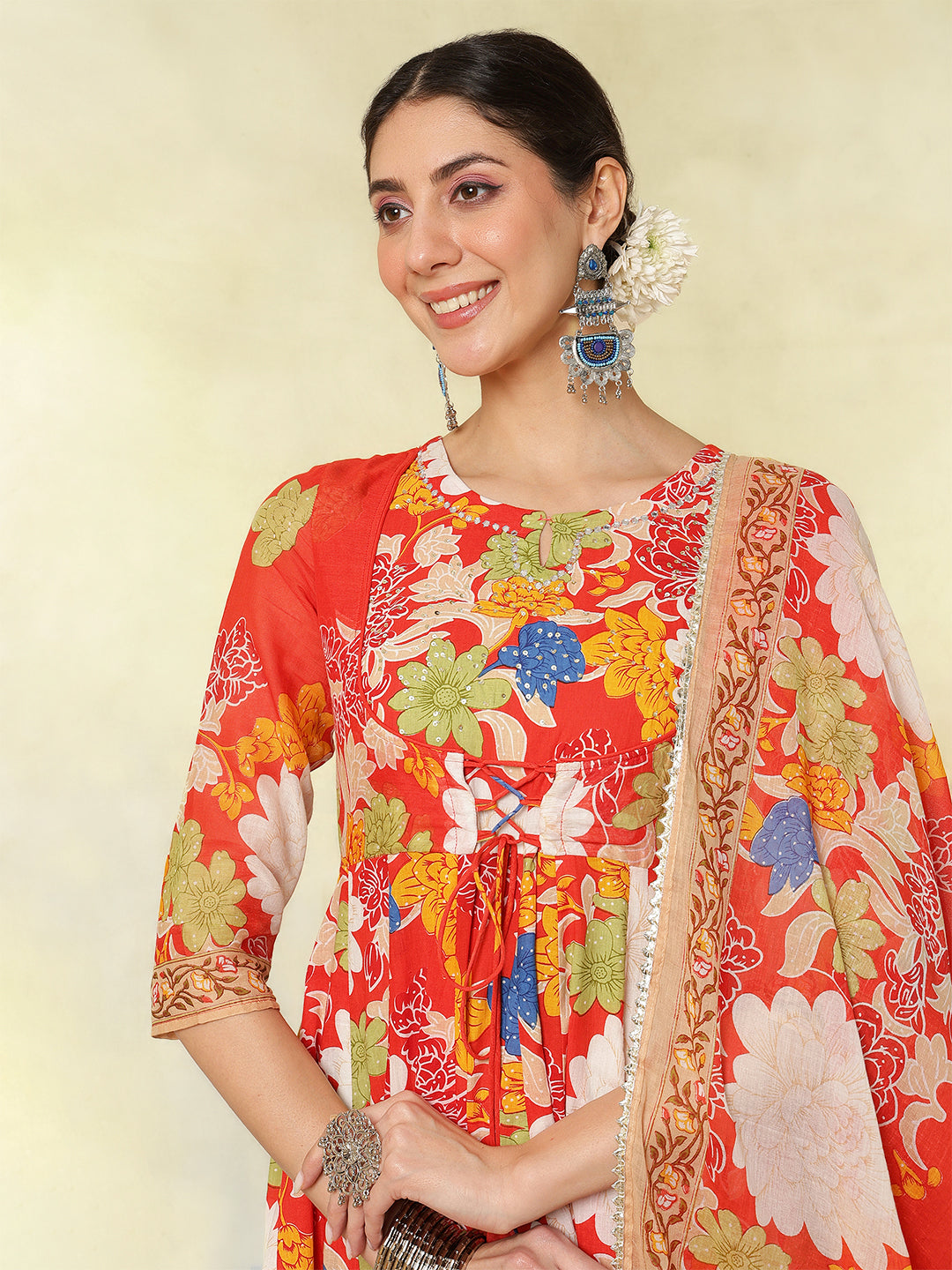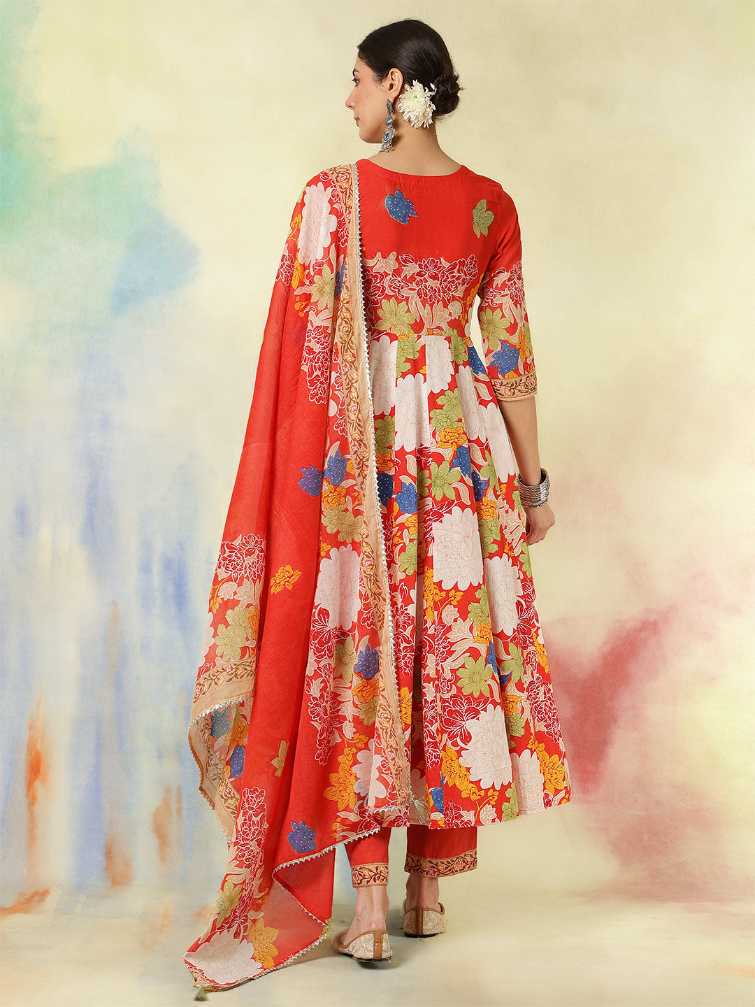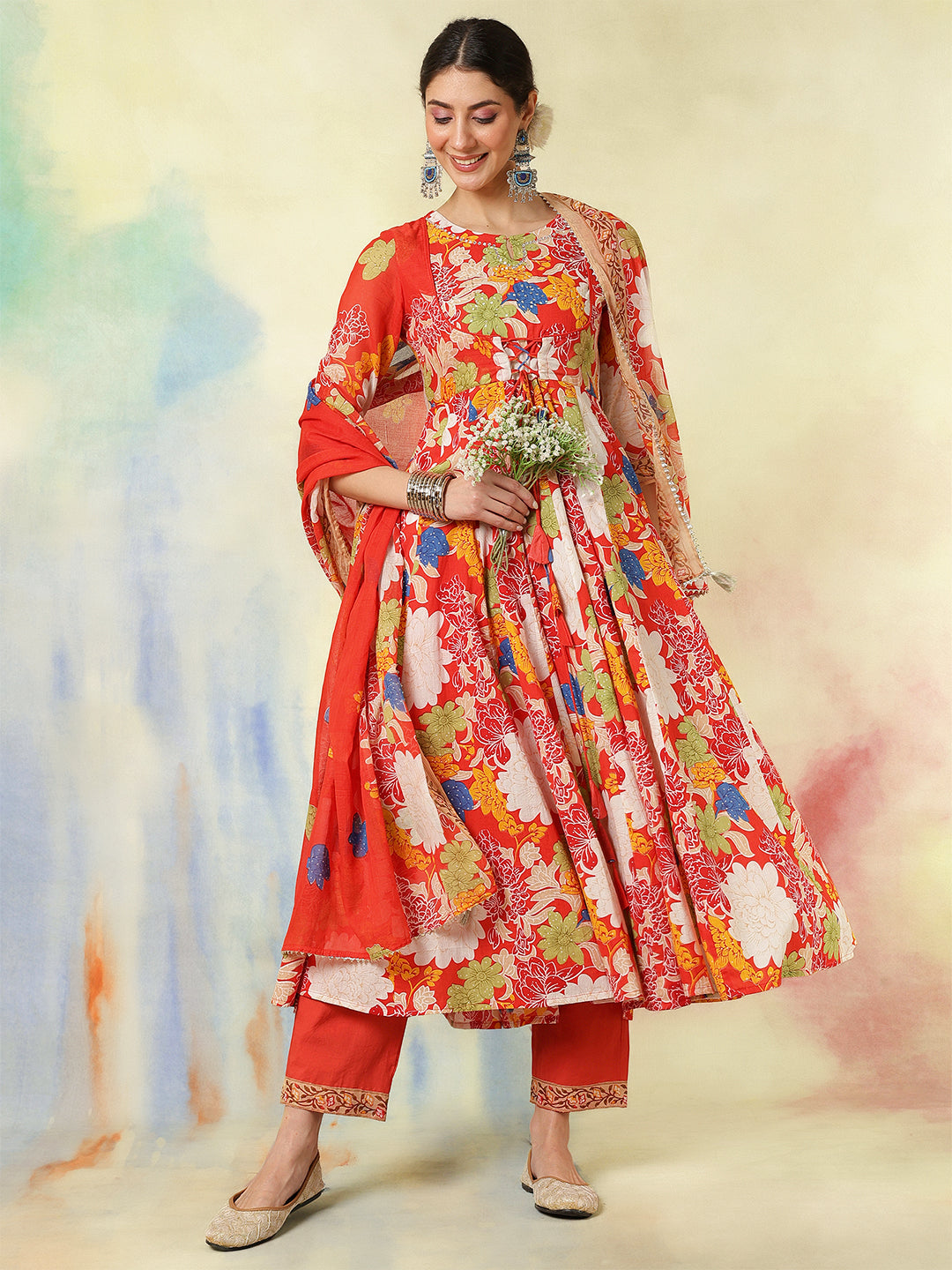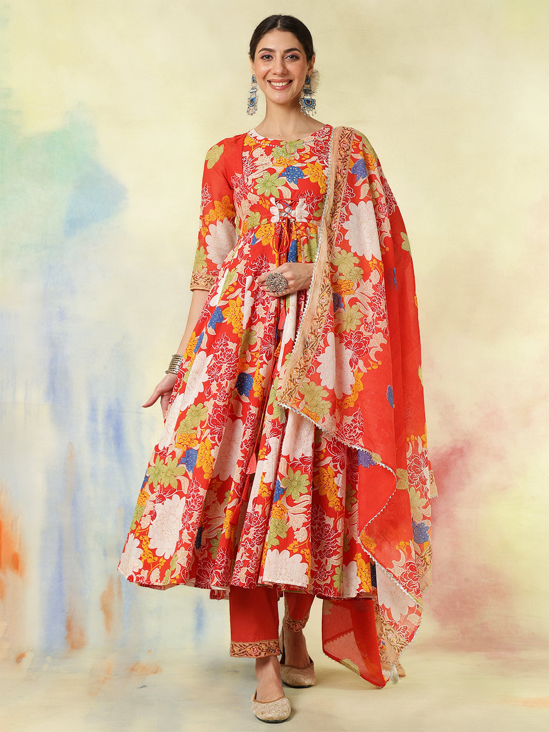 Red Cotton Flared Printed A-Line 3/4 Sleeves Round Neck Kurta Suit Set