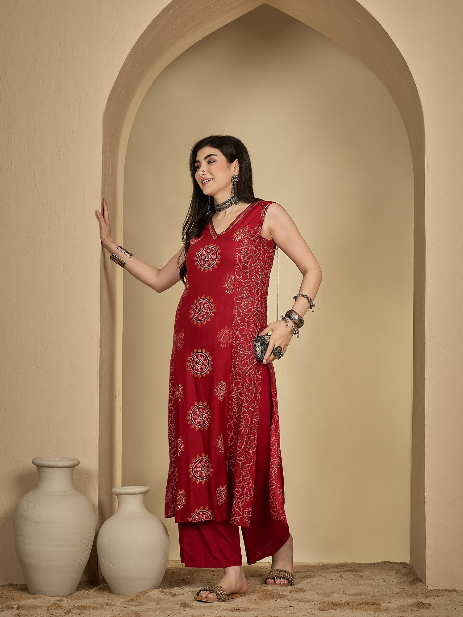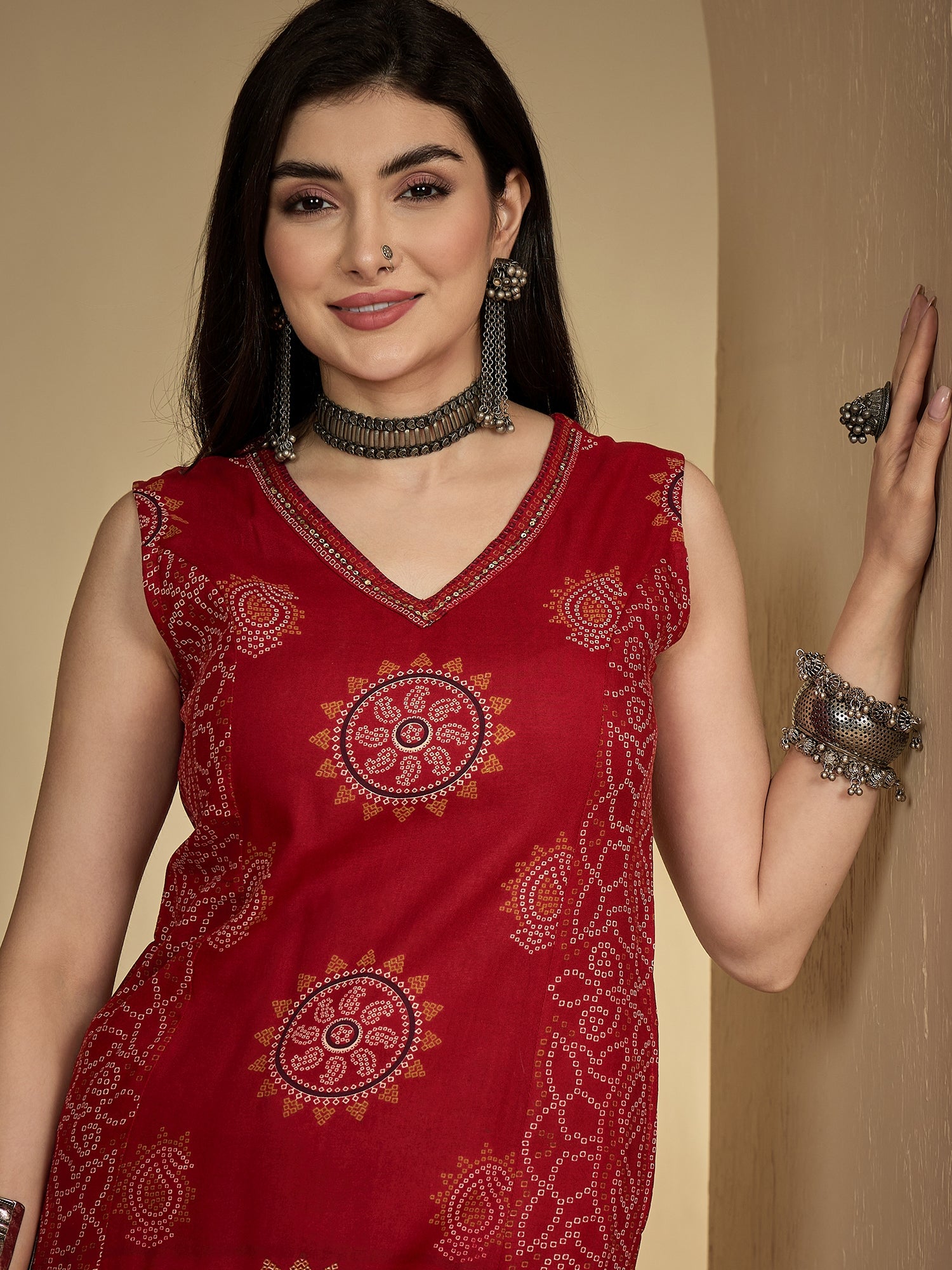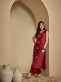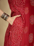 Red Rayon Calf Length Printed Sleeveless V-Neck A-Line Kurta Suit Set is crafted for those who love timeless fashion with everyday ease. The outfit drapes naturally, offering both movement and style. Suitable for work hours or simple day outings, it promises a refreshing and sophisticated touch.
