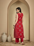 Red Rayon Calf Length Printed Sleeveless V-Neck A-Line Kurta Suit Set