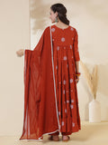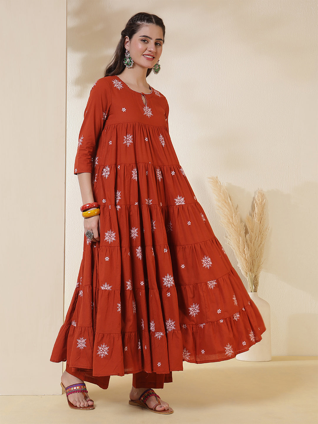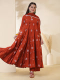 Rust Cotton Calf Length Printed 3/4 Sleeves Key Hole Neck Anarkali Kurta Suit Set