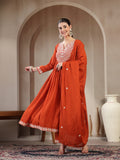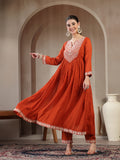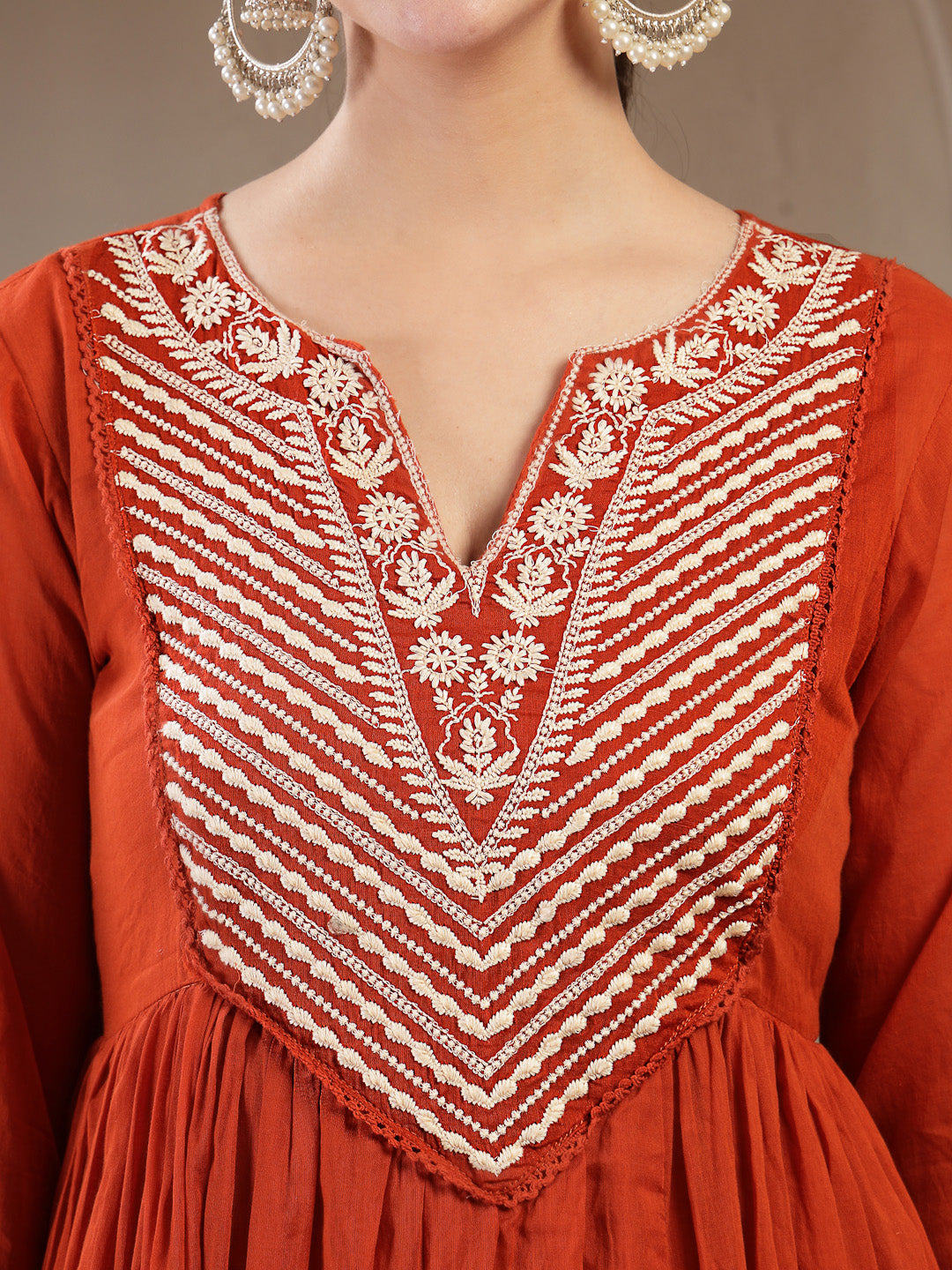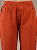 Rust Cotton Calf Length Solid 3/4 Sleeve Round Neck Flared Kurta Suit Set brings a fresh blend of comfort and elegance, crafted with attention to detail. Its design makes it perfect for daily wear as well as casual outings, offering effortless style. Soft fabric ensures comfort through the day, keeping the look refined and graceful.