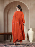 Rust Cotton Calf Length Solid 3/4 Sleeve Round Neck Flared Kurta Suit Set
