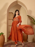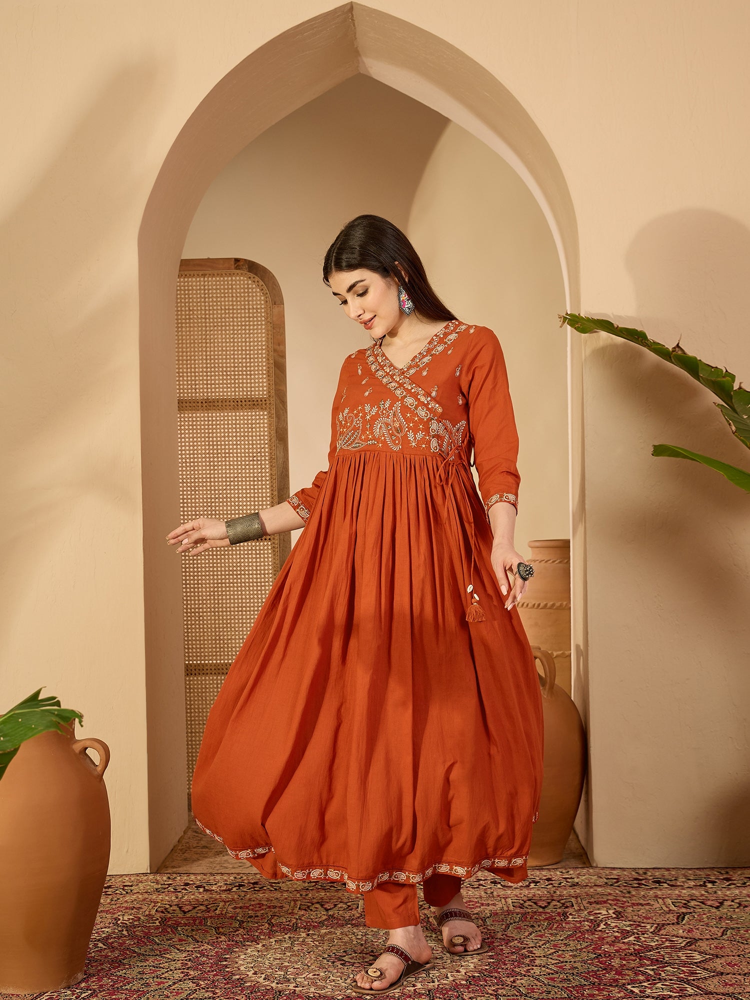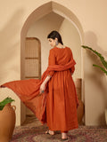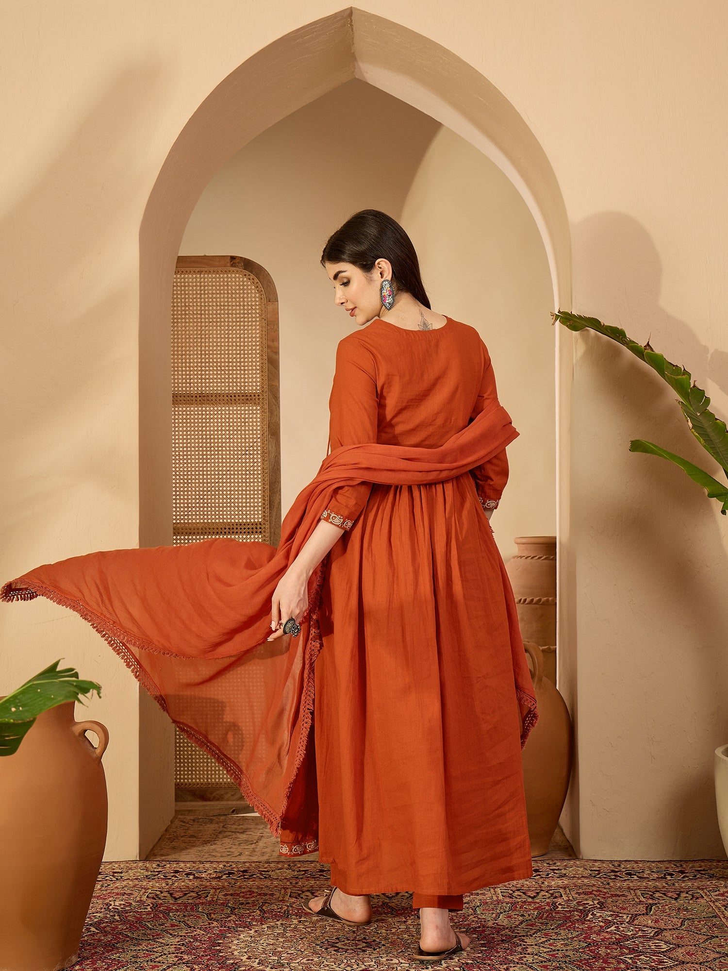 Rust Cotton Calf Length Solid 3/4 Sleeve V-Neck Anarkali Kurta Suit Set