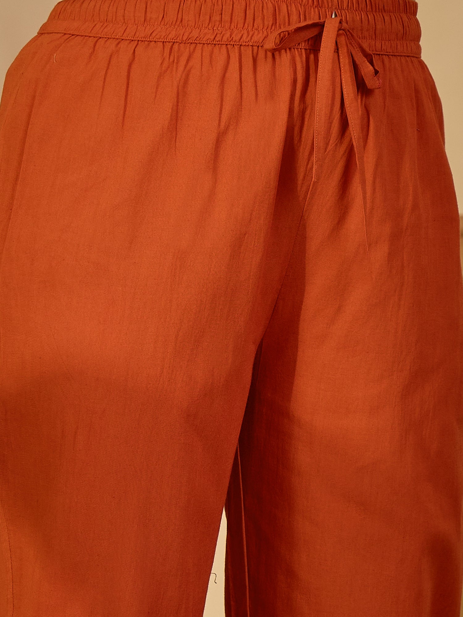 Rust Cotton Calf Length Solid 3/4 Sleeve V-Neck Anarkali Kurta Suit Set is crafted for those who love timeless fashion with everyday ease. The outfit drapes naturally, offering both movement and style. Suitable for work hours or simple day outings, it promises a refreshing and sophisticated touch.