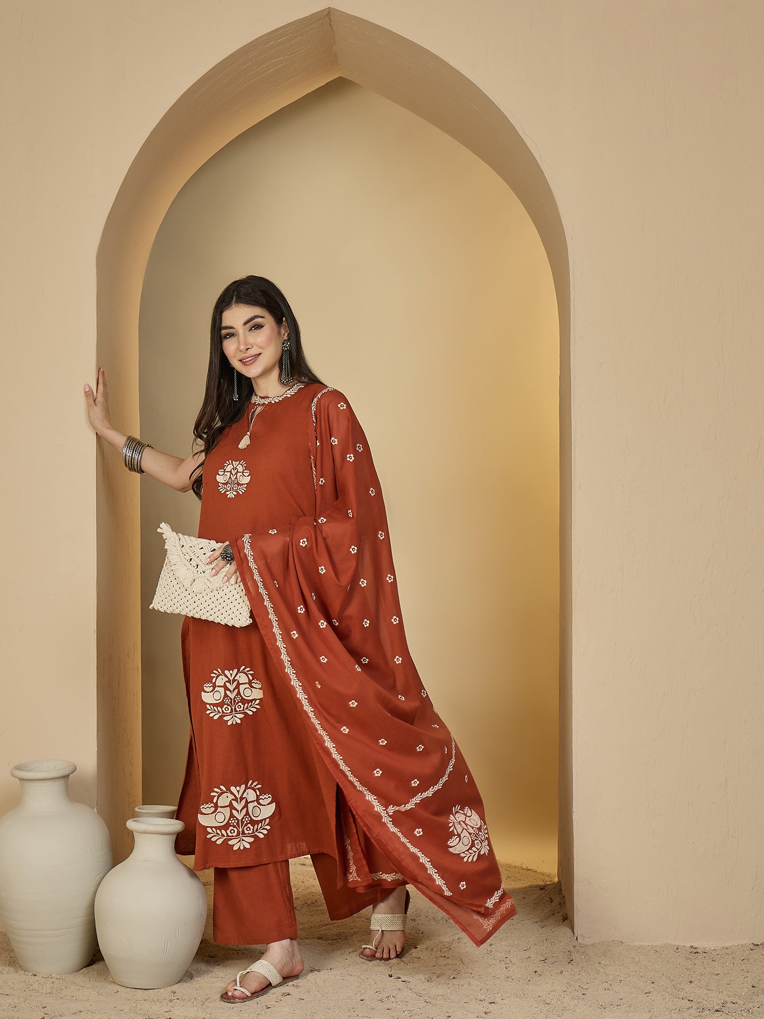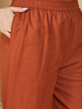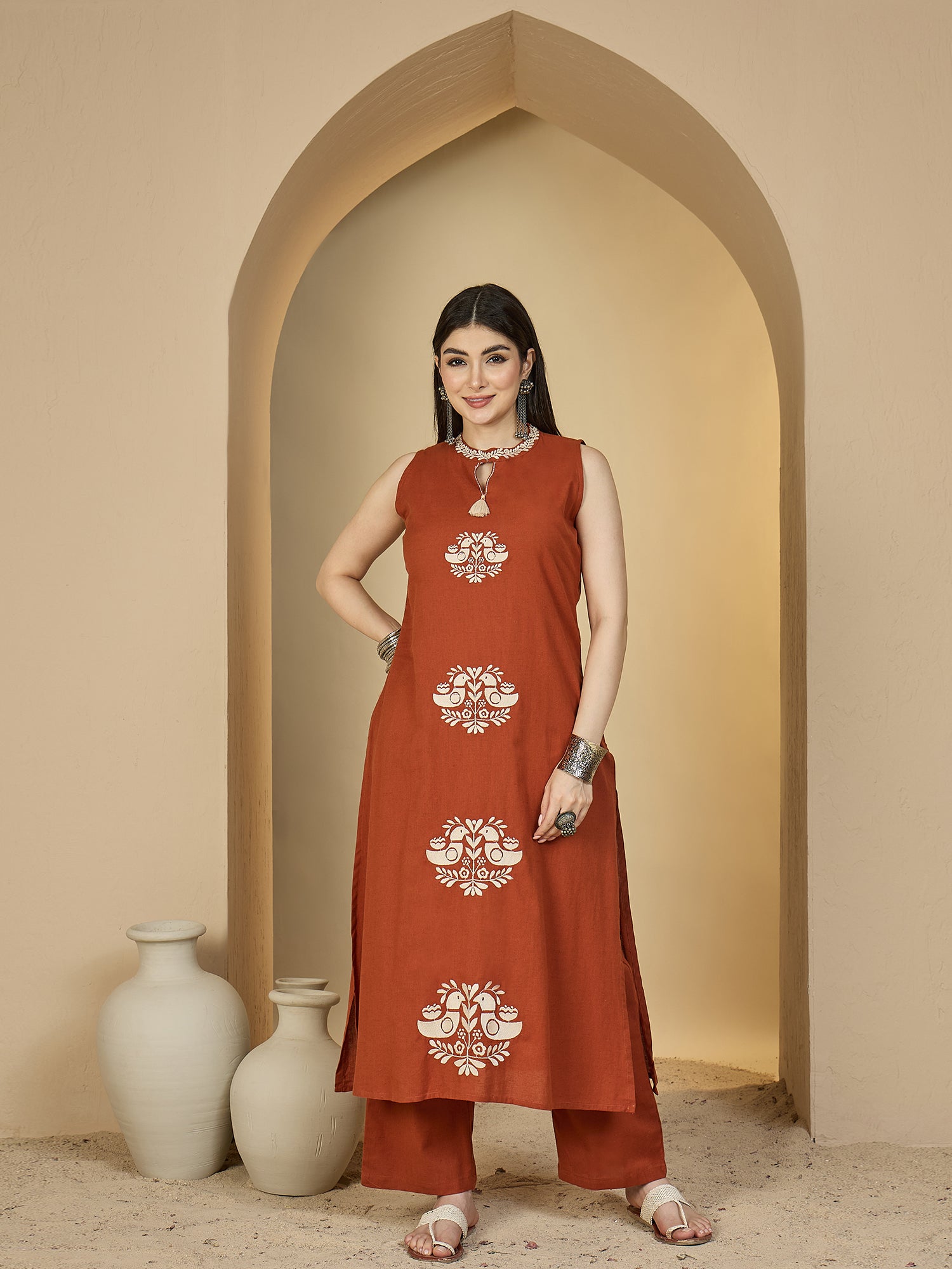 Upgrade your wardrobe with Rust Cotton Calf Length Solid Sleeveless Round Neck Straight Kurta Suit Set, designed for a chic and versatile appeal. The silhouette falls beautifully, giving a flattering shape while keeping the outfit breathable. A perfect pick for casual gatherings, office wear and everyday elegance.