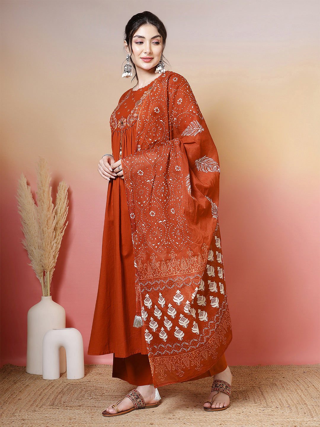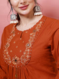Rust Rayon Calf Length Solid 3/4 Sleeves Round Neck Flared Kurta Suit Set