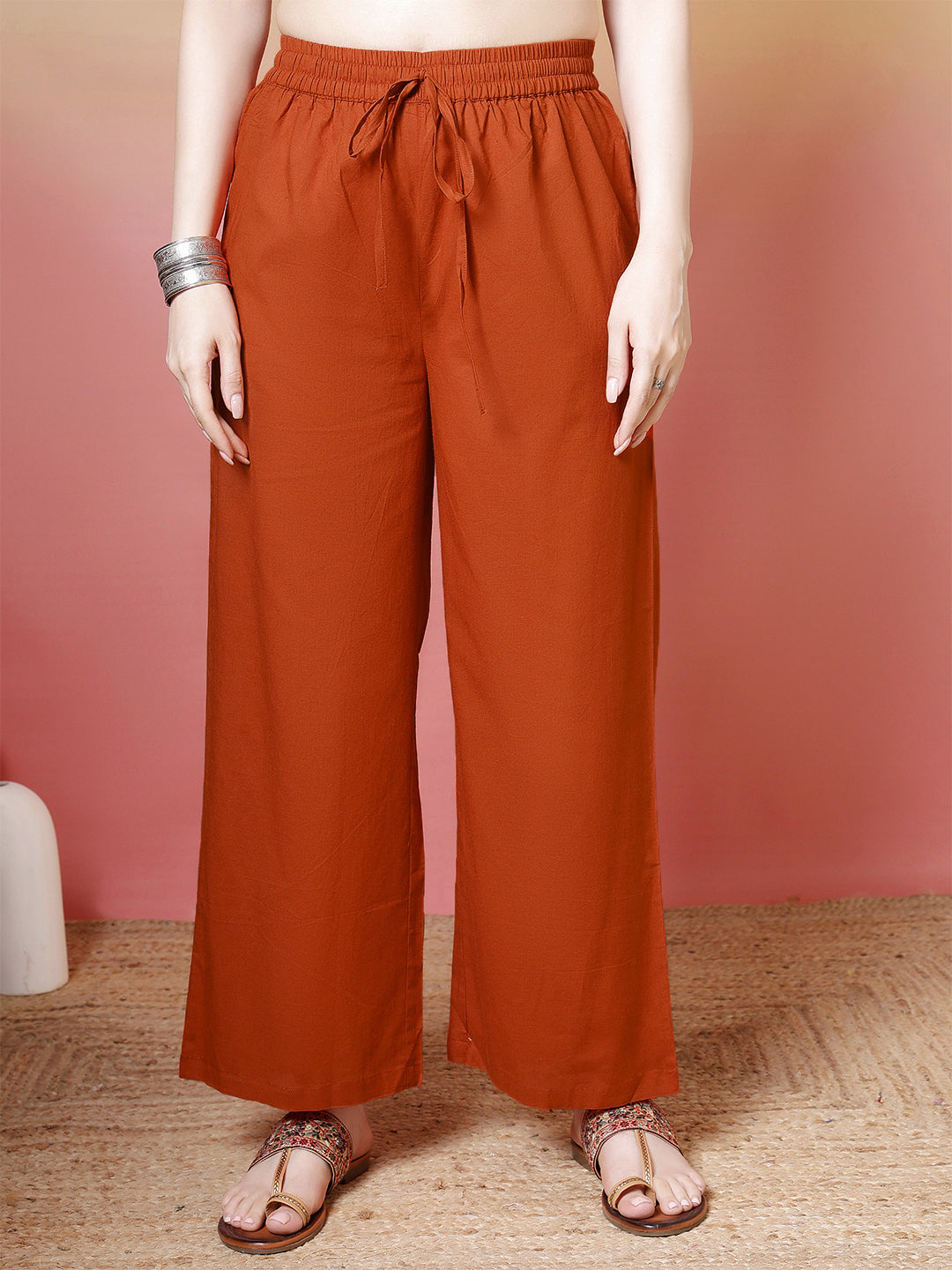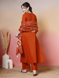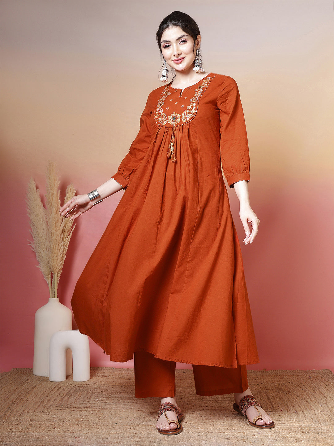 Make a subtle yet stylish statement with Rust Rayon Calf Length Solid 3/4 Sleeves Round Neck Flared Kurta Suit Set. The design offers a balanced mix of modern charm and traditional comfort. Its easy-fit structure makes it ideal for long hours, while the overall look stays effortlessly polished.