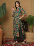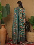 Teal Cotton Calf Length Printed 3/4 Sleeves Mandarin Collar Straight Kurta Suit Set