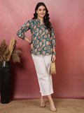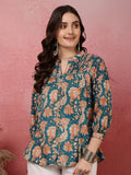 Teal Women Printed 3/4 Sleeves Regular Pure Cotton Top