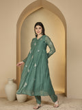 Turquoise Chanderi Calf Length Solid 3/4 Sleeves V-Neck Flared Kurta Suit Set