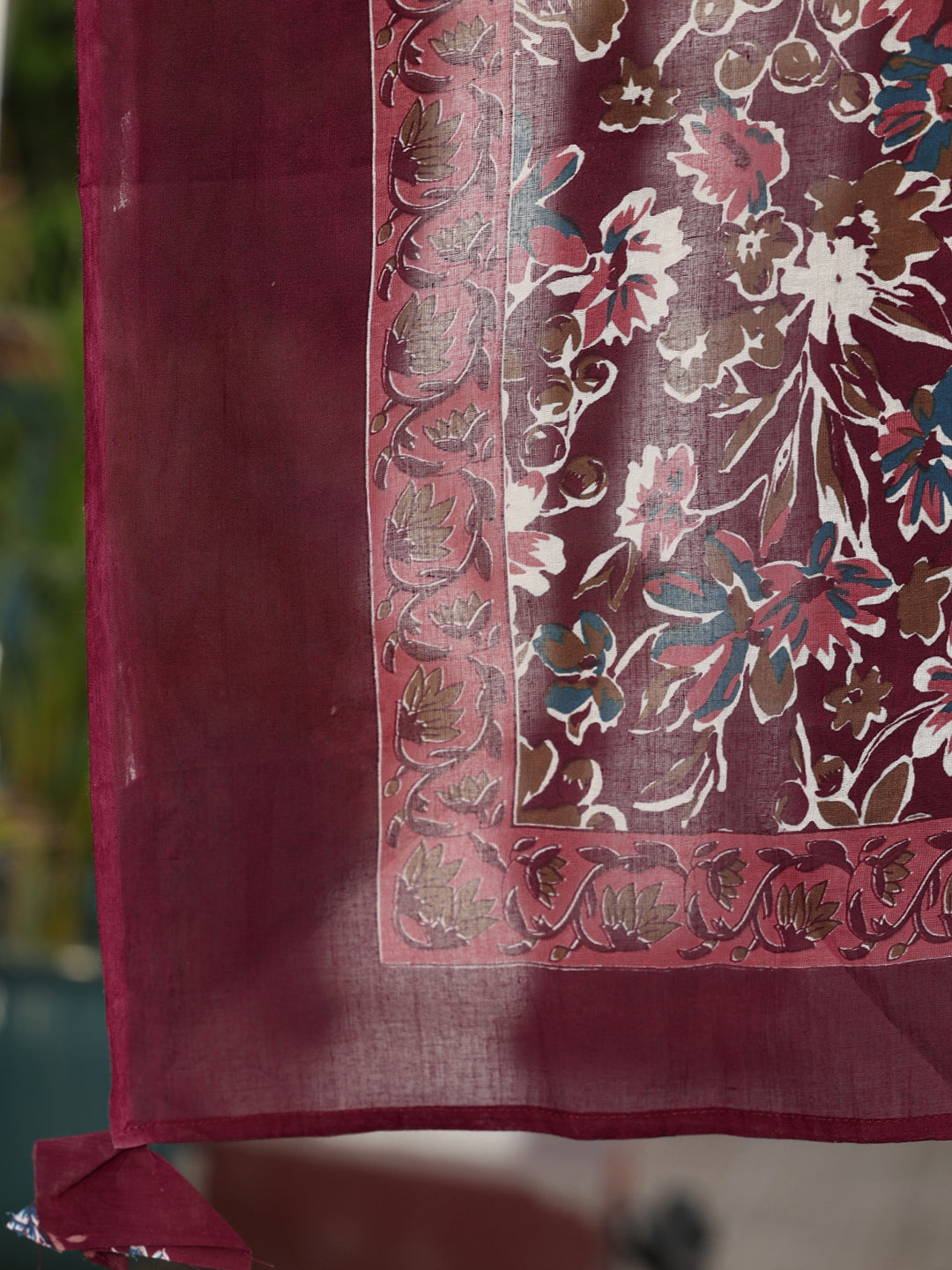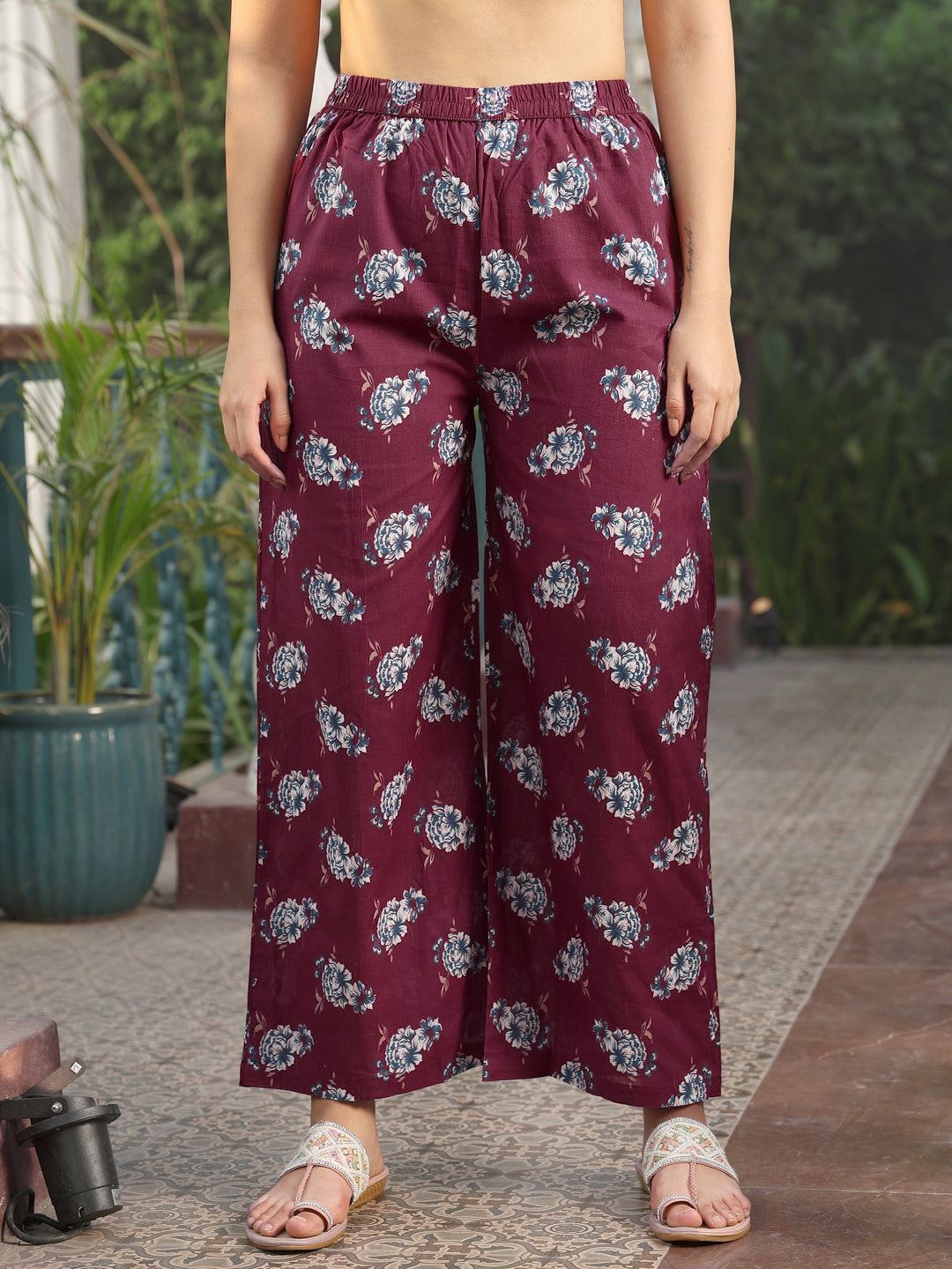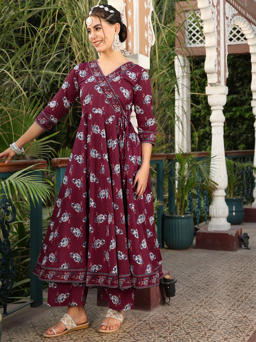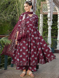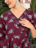 Wine Cotton Calf Length Printed Flared 3/4 Sleeves V-Neck Kurta Suit Set adds a refined charm to your wardrobe with its thoughtfully crafted silhouette. Light, comfortable and stylish, it works well for daily use, informal meet-ups or relaxed occasions, keeping you effortlessly fashionable.
