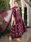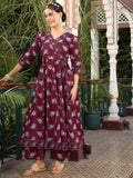 Wine Cotton Calf Length Printed Flared 3/4 Sleeves V-Neck Kurta Suit Set