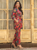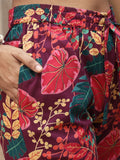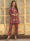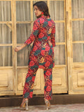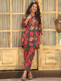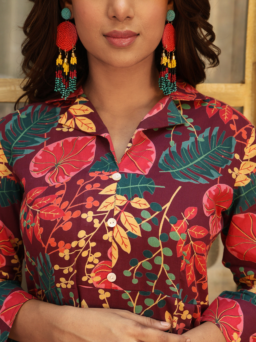 Wine Cotton Hip Length Printed Flared 3/4 Sleeves Shirt Coller Co-Ord Set
