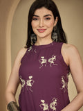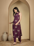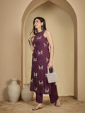 Wine Rayon Calf Length Printed Sleeveless Round Neck A-Line Kurta Suit Set