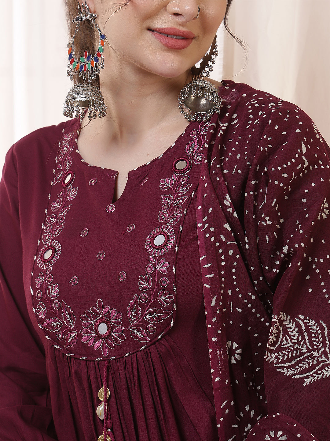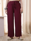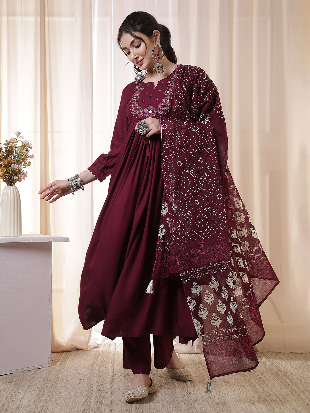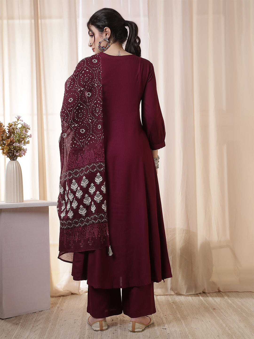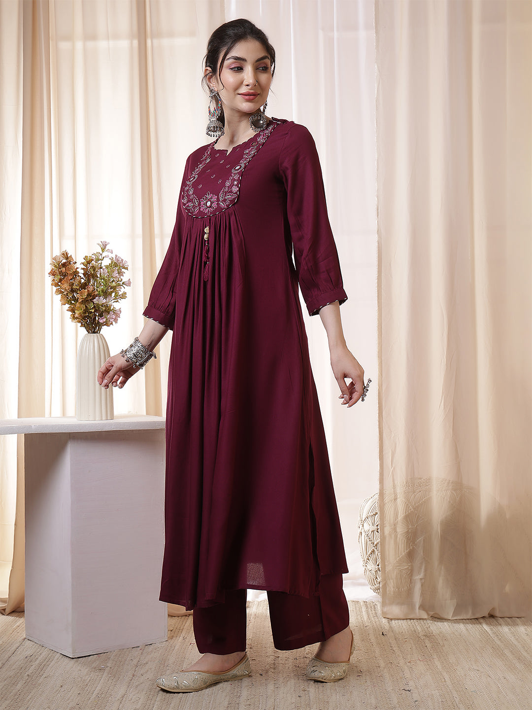 Upgrade your wardrobe with Wine Rayon Calf Length Solid 3/4 Sleeves Round Neck Flared Kurta Suit Set, designed for a chic and versatile appeal. The silhouette falls beautifully, giving a flattering shape while keeping the outfit breathable. A perfect pick for casual gatherings, office wear and everyday elegance.