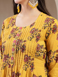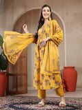 Yellow Cotton Calf Length Printed 3/4 Sleeve Round Neck A Line Kurta Suit Set